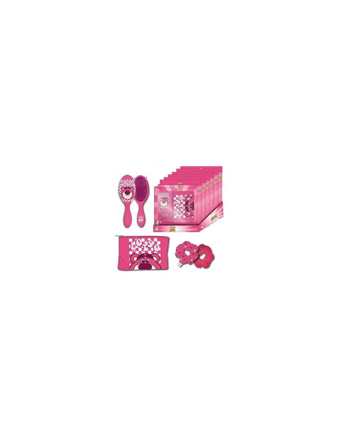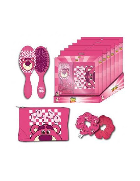 El set incluye un cepillo para el pelo, 2 coleteros y un estuche a juego, ambos con la cara sonriente de Lotso. Estos prácticos accesorios te ayudarán a mantener tu pelo sedoso y bien peinado durante todo el día.
