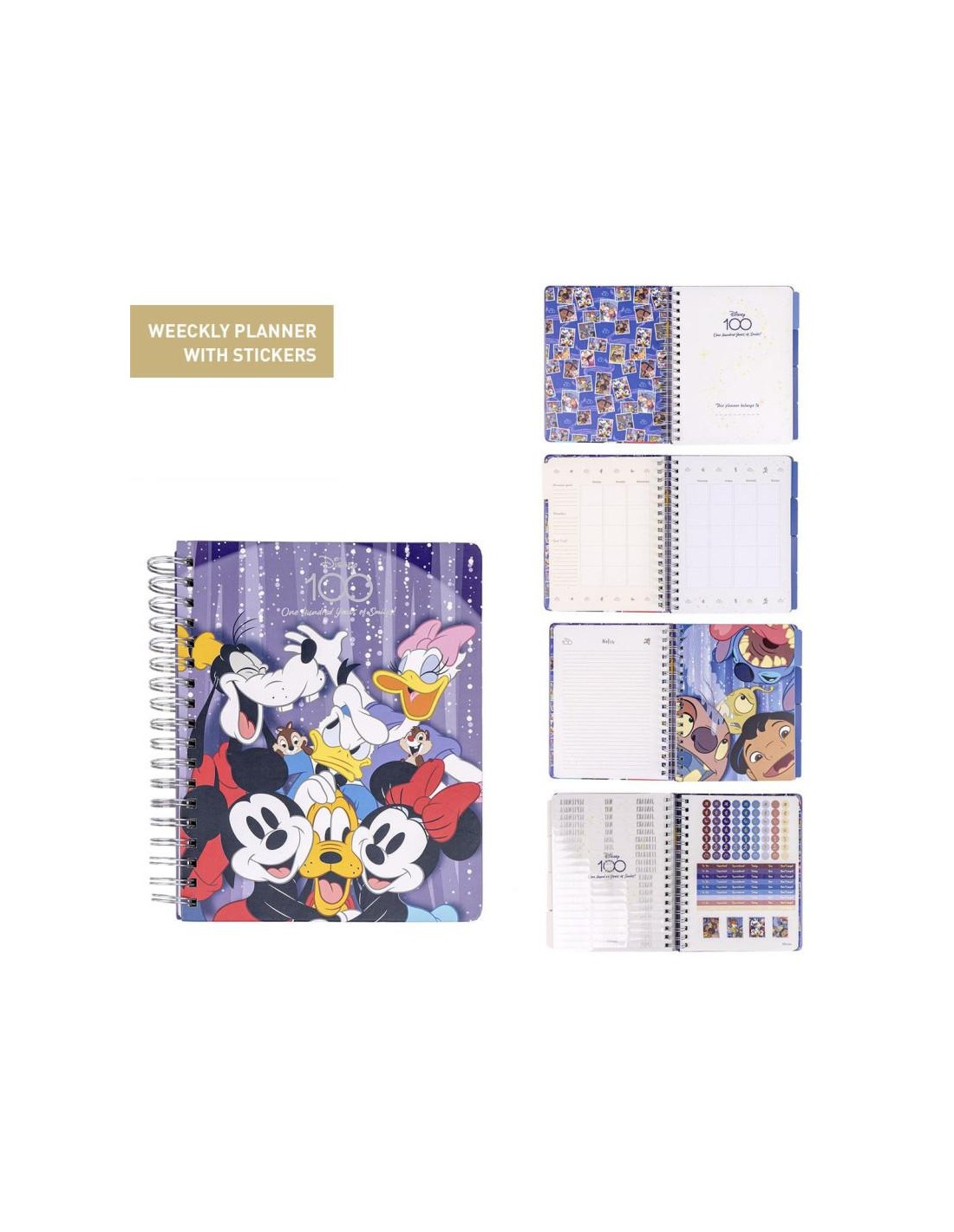 Planificador del Disney 100 aniversario El bloc incluye 12 separadores mensuales y calendario semanal pensado para que lo puedas usar en cualquier año y en cualquier momento del año, notas y más de 225 pegatinas.