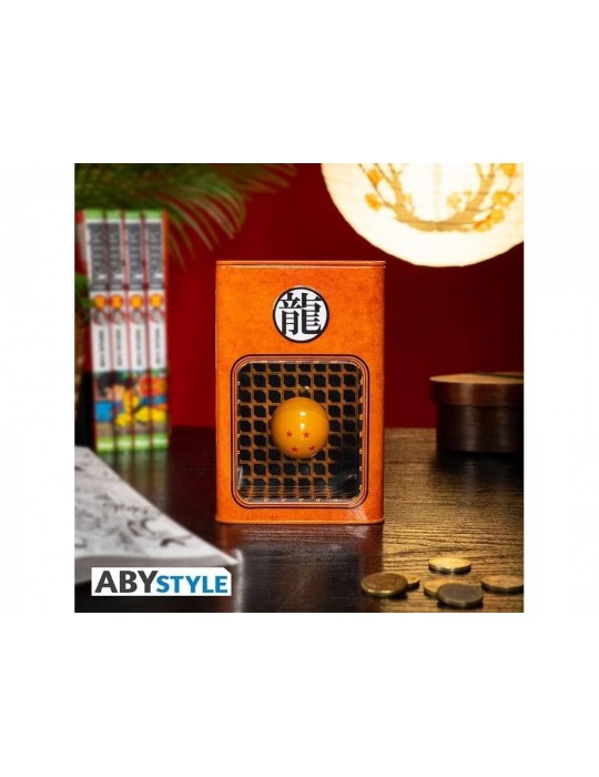 Producto oficial de 16x10 cm fabricado en metal con una pátina que le aporta un efecto de latón. Diseño del Dragon Shenron, cuyo dibujo aparece en la parte lateral, y el efecto óptico de que en el interior de esta hucha está flotando la bola de dragón número 4.