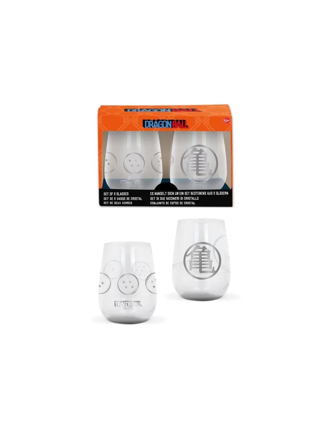 Set 2 vasos del Anime Dragon Ball. Sus diseños estan compuestos por un lado por las Bolas de Dragon que cuando se reúnen se utilizan para invocar a un dragón que concede uno o varios deseos y por el otro el Kanji Kame del Maestro Roshi (kame). Significa "tortuga". Es otorgado y utilizado por todos los estudiantes del Maestro Roshi al final de su formación (Goku, Krilin y Yamcha). No apto para lavavajillas y microondas. Material: Cristal. Capacidad: 510 ml.