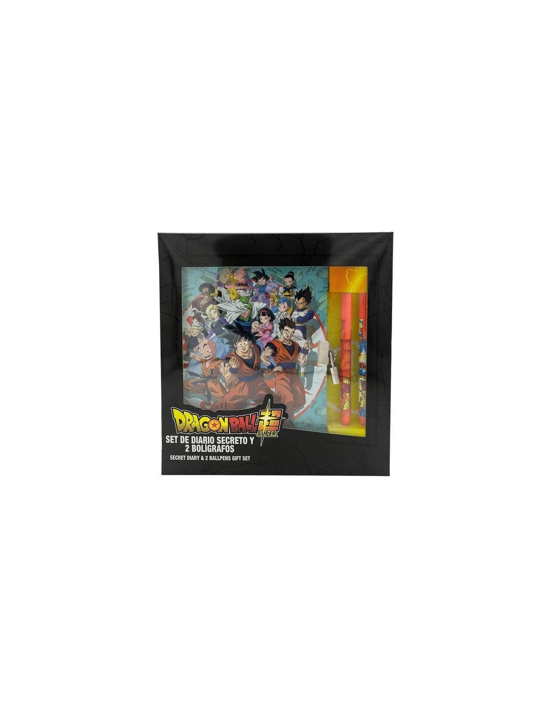 Set Diario Secreto y 2 bolis del Anime Dragon Ball Super. En el diseño del diario podemos observar a casi todo el elenco del anime, tales como Goku, Gohan, Krilin, Videl, Pan, Vegeta, Bulma, Milk, Trunks, Goten, Buu, Mr.Satan, Numero 18, Piccolo y Marron. El diario contiene raya horizontal que permite una escritura más cómoda y organizada y un candado que te ayudara a resguardar tus secretos de Guerrero Super Saiyan. Tamaño: 24x22x2,5 cm.