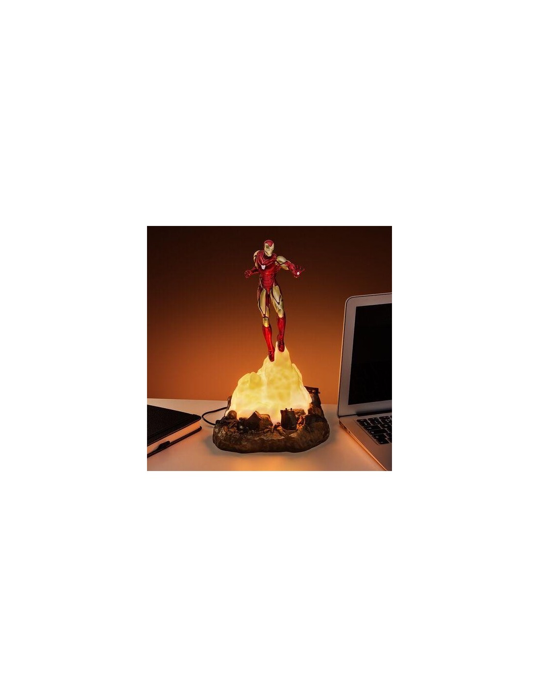 Lámpara Diorama de Iron Man volando de 18 cm. La lámpara se alimenta mediante un cable USB y tiene 3 niveles ajustables de brillo que puedes cambiar girando la piedra.