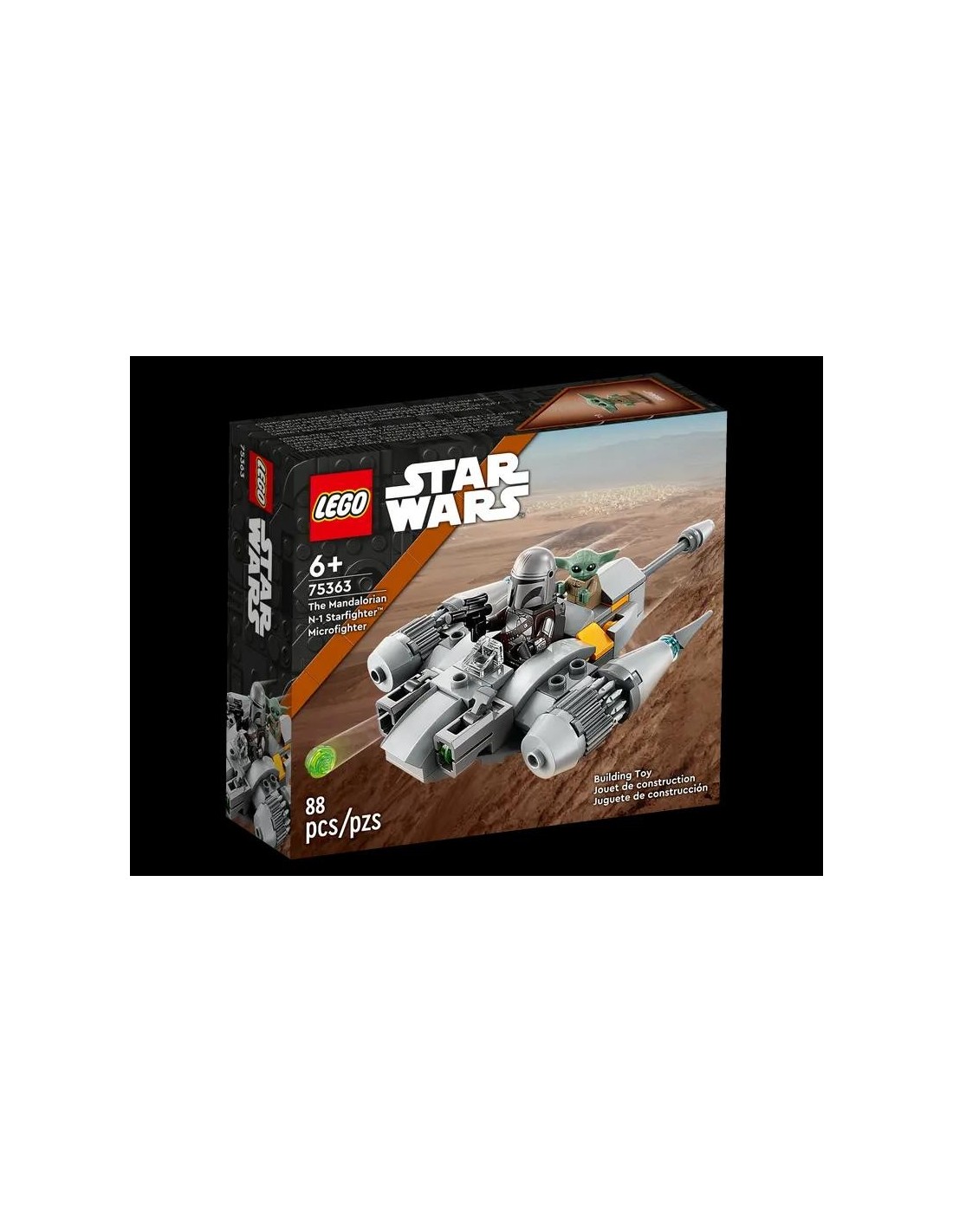 Inicia a tu peque en el mundo de los sets LEGO® Star Wars™ con el Microfighter: Caza Estelar N-1 de The Mandalorian (75363). Este modelo LEGO de un caza estelar N-1 se construye rápidamente, cuenta con cabina abierta para la minifigura LEGO del Mandaloriano, con espacio para la figura LEGO de Grogu, y está equipado con 2 cañones. El Mandaloriano trae una pistola bláster y una mochila propulsora para dar paso al juego de acción. Este juguete de construcción, fantástico como regalo para niños y niñas a partir de 6 años, combina genial con otros sets LEGO Star Wars Microfighters. LEGO Builder Descubre LEGO Builder, una app que ofrece a tu peque una intuitiva aventura de construcción. Podrá acercar y girar una versión digital en 3D de su modelo, controlar su avance y mucho más. Una galaxia de creatividad The LEGO Group lleva recreando naves, vehículos, lugares y personajes del universo Star Wars desde 1999. Explora la gama, con juguetes de construcción para fans de todas las edades.
