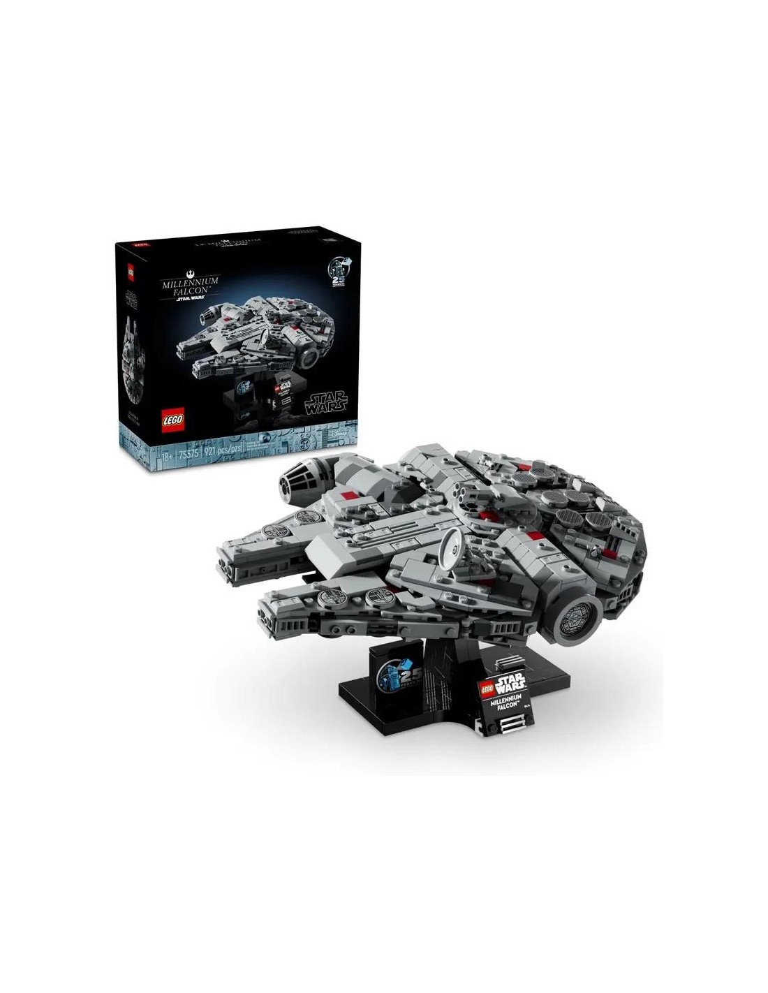- Diseñado como pieza de exposición: La base construible incorpora una placa de identificación y un ladrillo conmemorativo del 25 aniversario de LEGO Star Wars, y permite colocar el Halcón Milenario en ángulo para aportar dinamismo