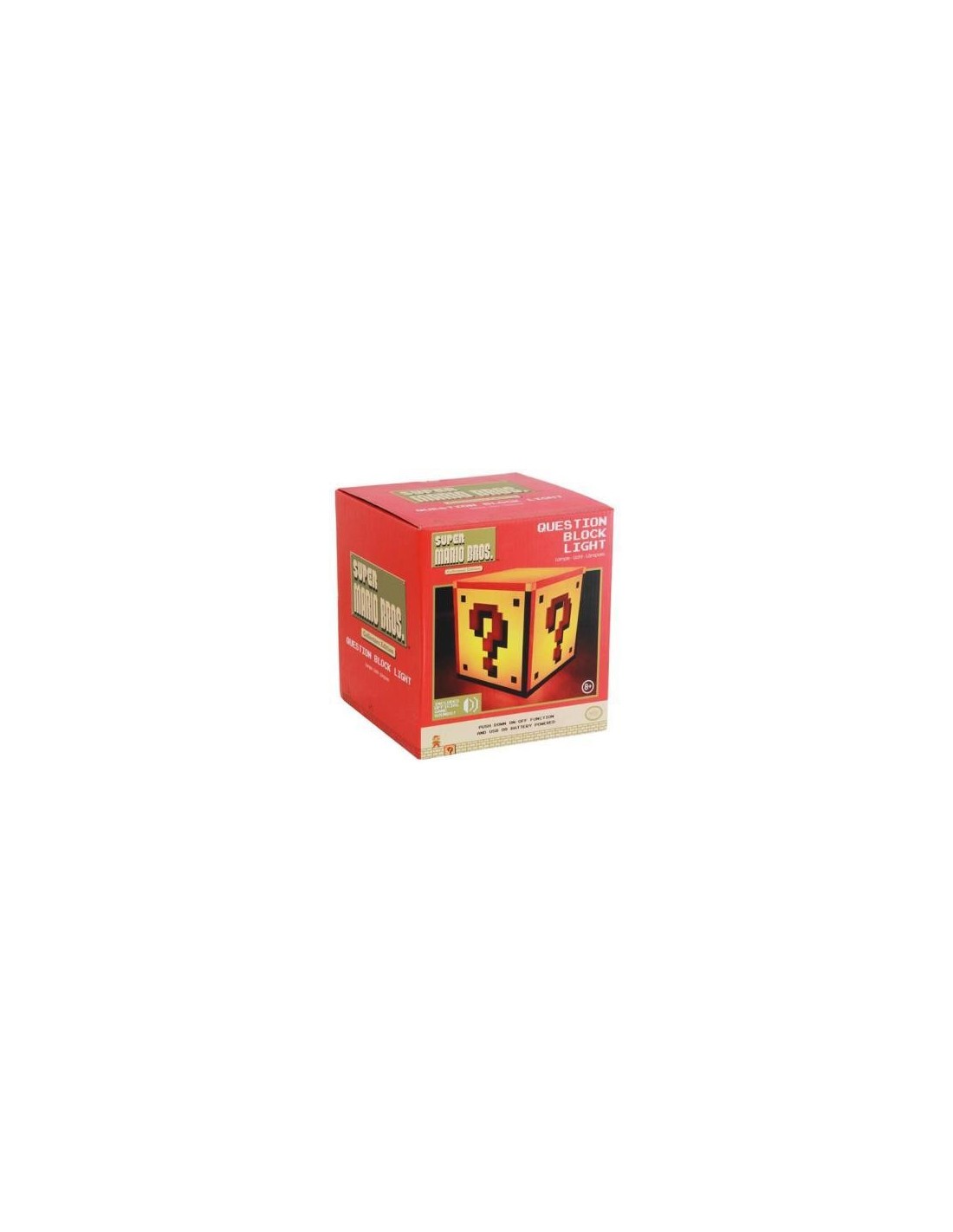 Lampara decorativa Question Block de Super Mario. Admite pilas y conexión micro USB. Tamaño: 18x16cm.
