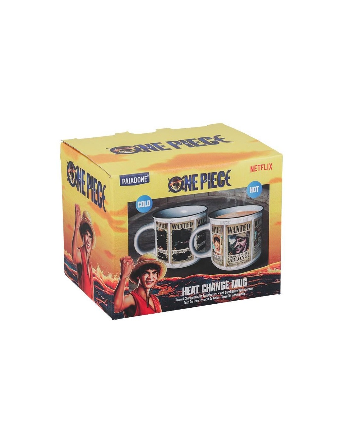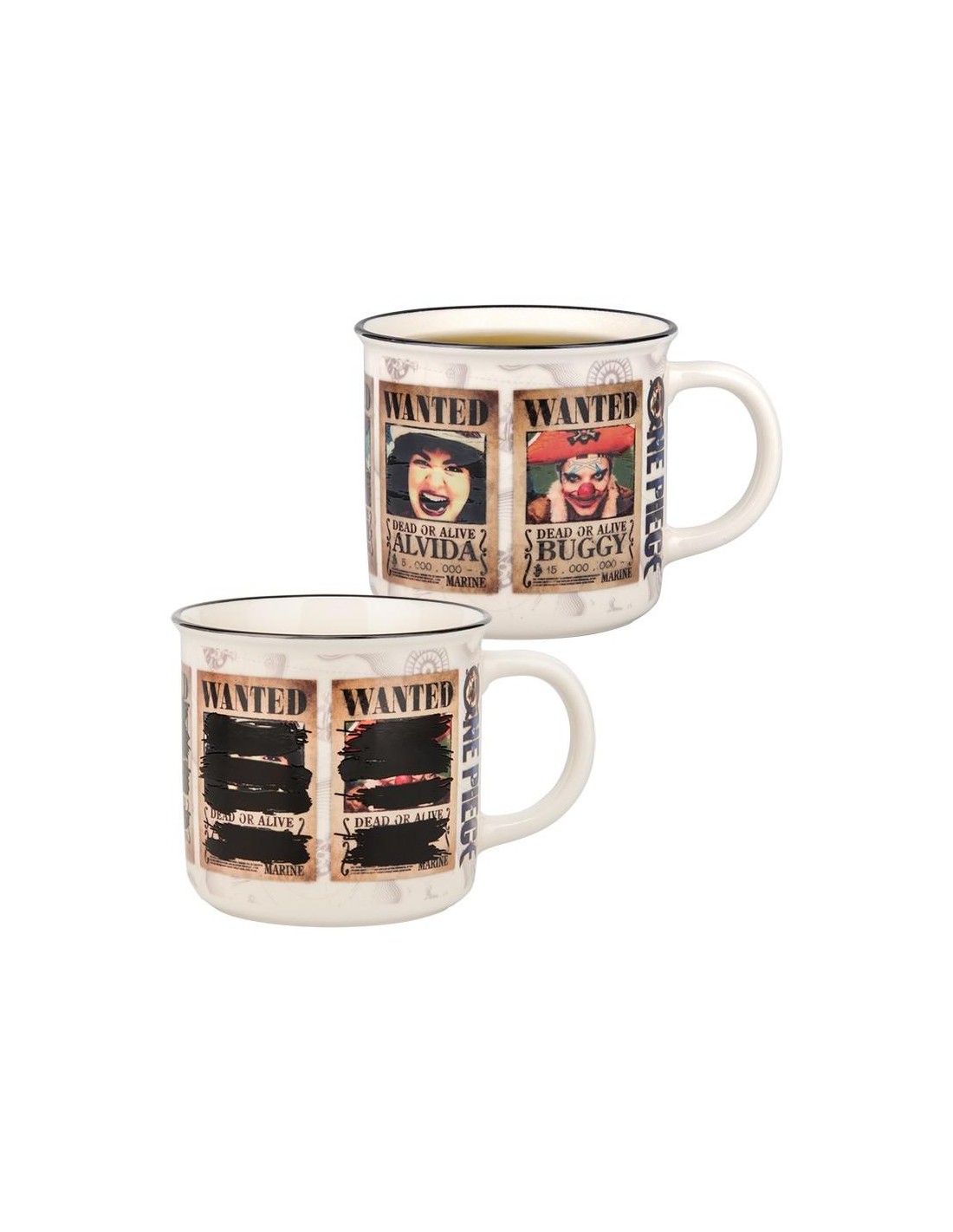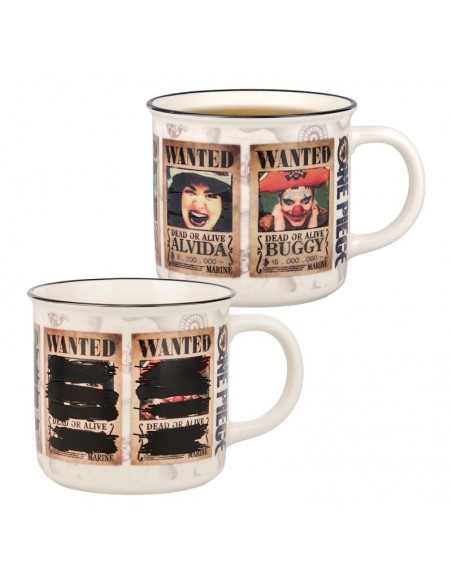 Esta taza presenta un diseño espectacular inspirado en los cartelones de ´Se busca´ con personajes icónicos de la serie, como Monkey D. Luffy y Arlong. Al verter una bebida caliente, la taza revela imágenes ocultas, creando un efecto mágico que sorprenderá a todos los fans.