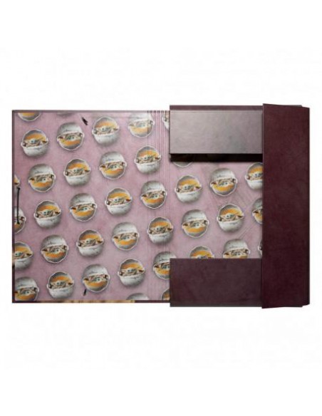 Se trata de una carpeta de gran calidad, con cierre de goma elástica, elaborada con tapa dura de cartón de 2 mm de espesor y forrada con papel laminado en mate. Tiene un tamaño de 24 x 34 cm e incluye 3 solapas flexibles, dos de 13 x 23 cm y una de 13x34. Además del exterior, el interior tiene un diseño personalizado, aportando un plus de calidad al producto.
