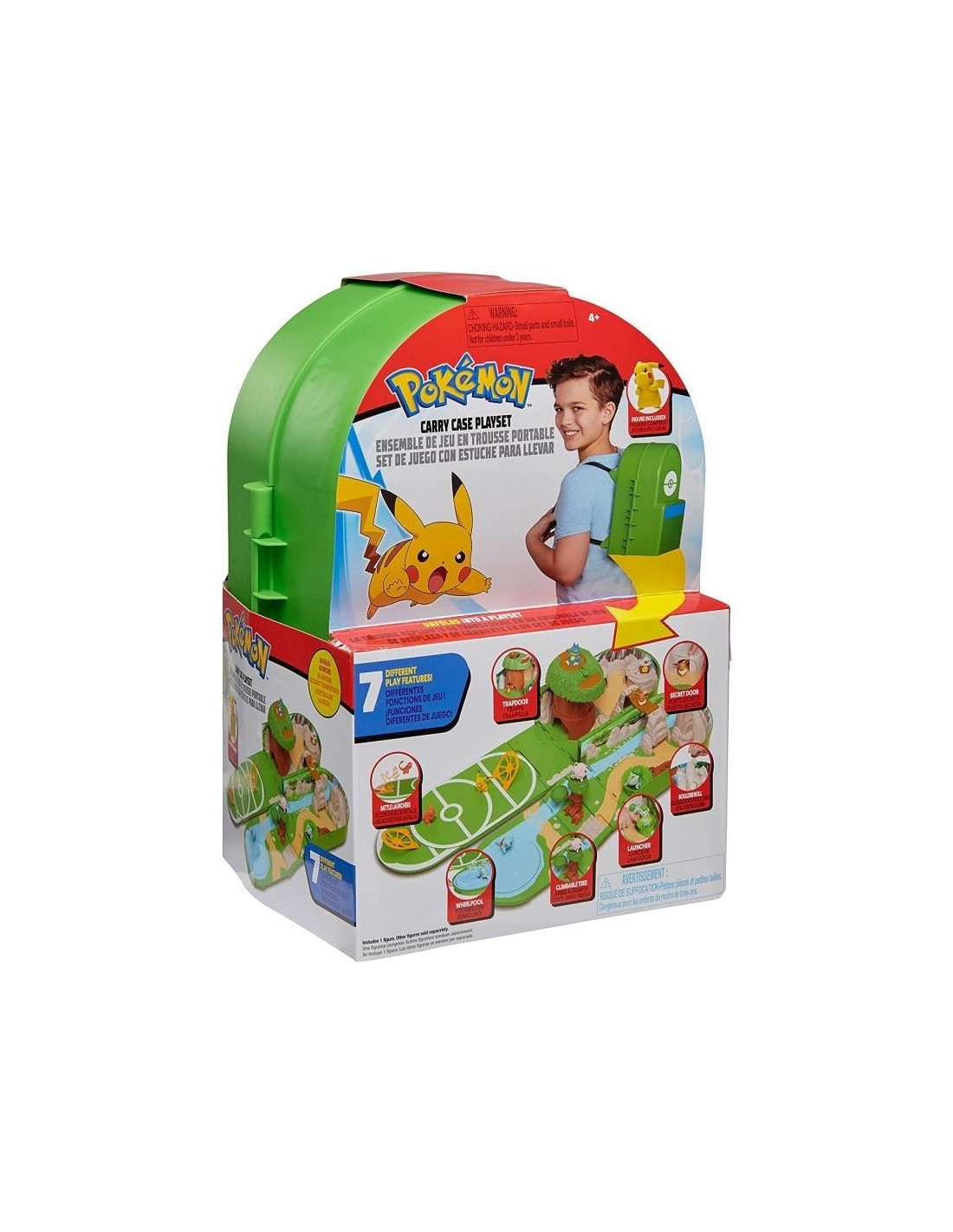 Mochila del mundo de Pokemon que se puede llevar a cualquier sitio. Es un playset transformable y con 6 zonas diferentes de juego: área de batalla, un lago, una casa del árbol, área de rocas, un puente, y un árbol. Incluye 1 mochila y 1 figura.