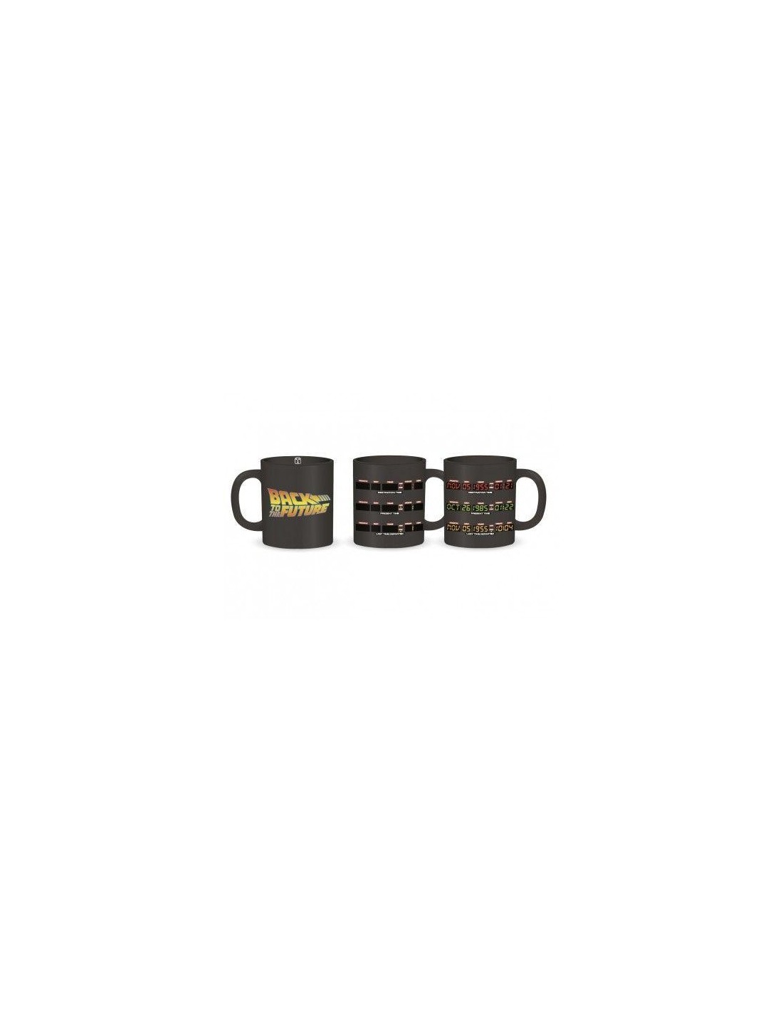 Taza térmica de Regreso al Futuro con capacidad para 400 ml. Fabricada en cerámica, diseño clásico color negro con las fechas de los viajes en el tiempo en diferentes colores que se descubren al echar líquido caliente.