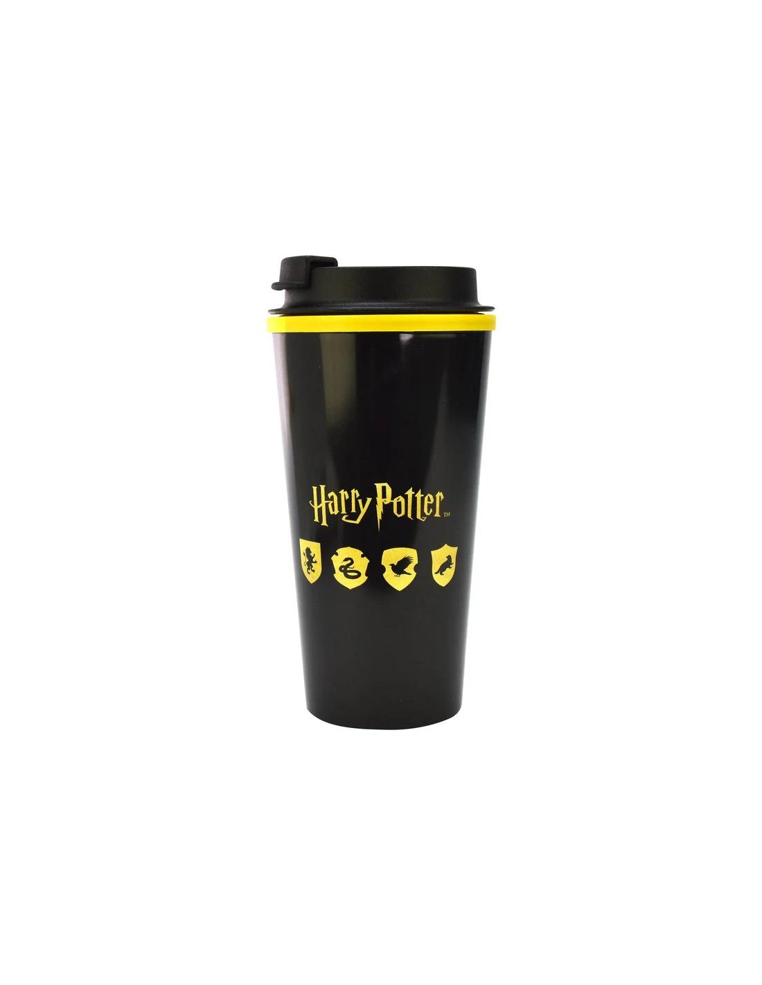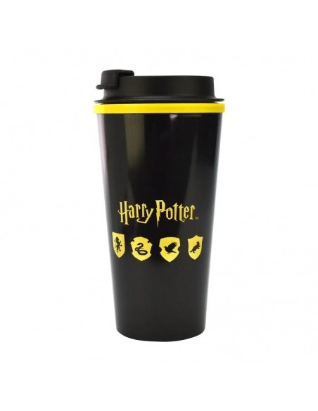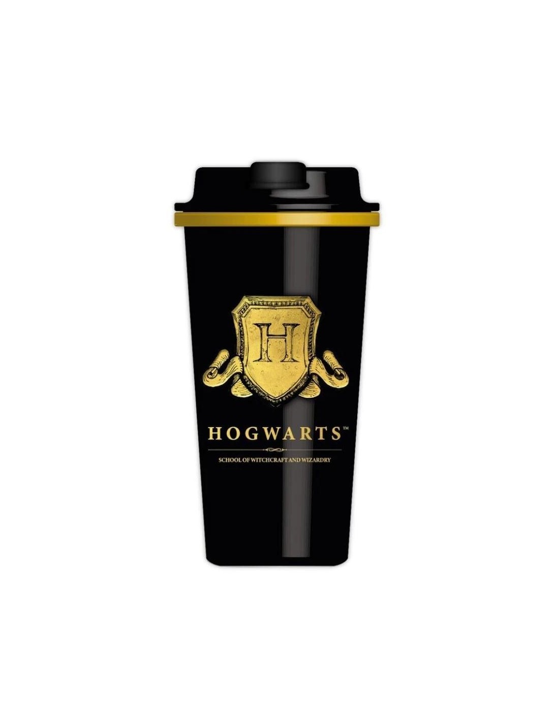 Vaso con tapa para viajes de Harry Potter. Con un elegante diseño en negro y dorado y una capacidad de 450 mls, este vaso con tapa es lo que necesitas para beber tus brebajes preferidos cuando estés de excursión, de viaje o dando un paseo. Tiene en dorado sobre fondo negro el símbolo del colegio Hogwarts de magia y hechicería en el que estudiaron Harry Potter y sus amigos.