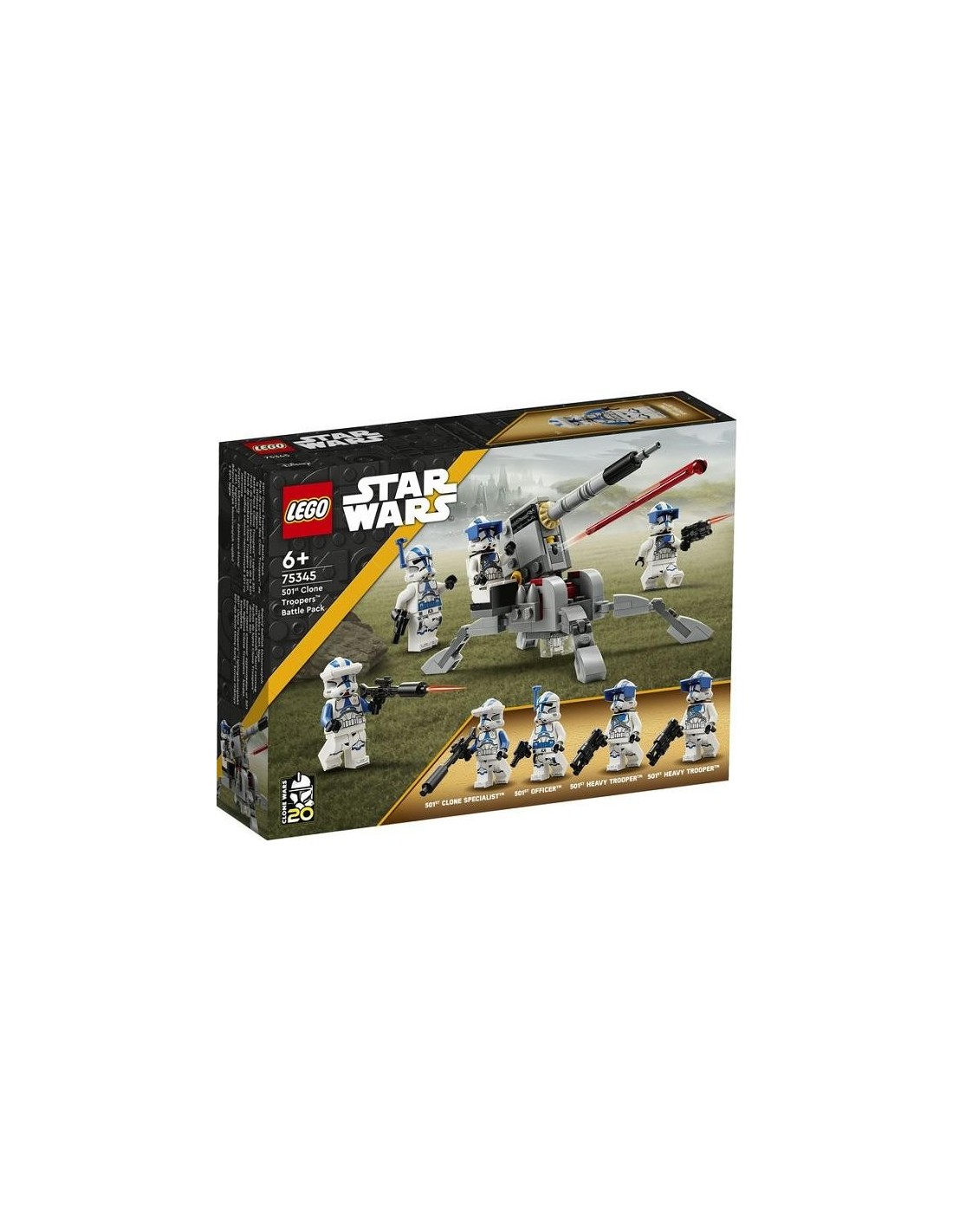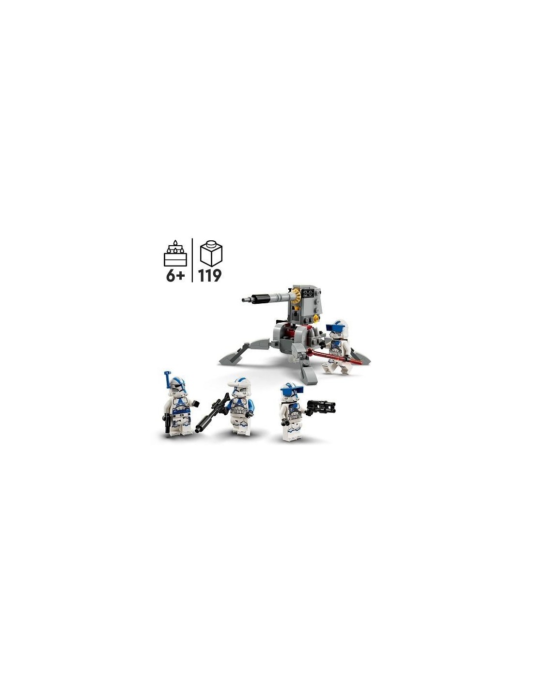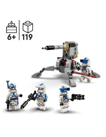Set de construcción diseñado para el juego de combate: Con el set LEGO® Star Wars Pack de Combate: Soldados Clon de la 501 (75345), tu peque podrá construir su propio escuadrón clon y recrear las trepidantes escenas de Star Wars: Las Guerras Clon 4 minifiguras LEGO® Star Wars: Un oficial de la 501 con una pistola bláster, un especialista clon de la 501 con un fusil bláster y 2 soldados pesados de la 501, cada uno con un bláster Cañón antivehículo AV-7 para construir: El AV-7 cuenta con patas ajustables, un cañón elevable, un cañón automático y un asiento para una minifigura LEGO® Idea de regalo para entusiastas de Star Wars a partir de 6 años: Regala este juguete de construcción de 119 piezas por su cumpleaños o en cualquier otra ocasión a un pequeño fan de Star Wars: Las Guerras Clon Juego portátil: La torreta del cañón mide aproximadamente 7 cm de altura, 6 cm de anchura y 13 cm de profundidad. Este set compacto cabe perfectamente en la mochila de los niños, listo para jugar donde surja la oportunidad Construcción digital interactiva: Con la app LEGO® Builder, los peques pueden acercar, girar y visualizar una versión digital de este modelo mientras lo construyen Juguetes de construcción LEGO® Star Wars para todas las edades: Los sets LEGO Star Wars permiten a los niños (y los fans adultos) recrear icónicas escenas, inventar sus propias aventuras de acción o, simplemente, exponer los modelos construibles Calidad extraordinaria: Los componentes LEGO® satisfacen exigentes estándares del sector para garantizar que se conecten con gran sencillez y firmeza, aportando solidez a los modelos Seguridad acreditada: Los ladrillos para construir LEGO® se prueban de prácticamente todas las formas imaginables para verificar que cumplen estrictas normas mundiales de seguridad