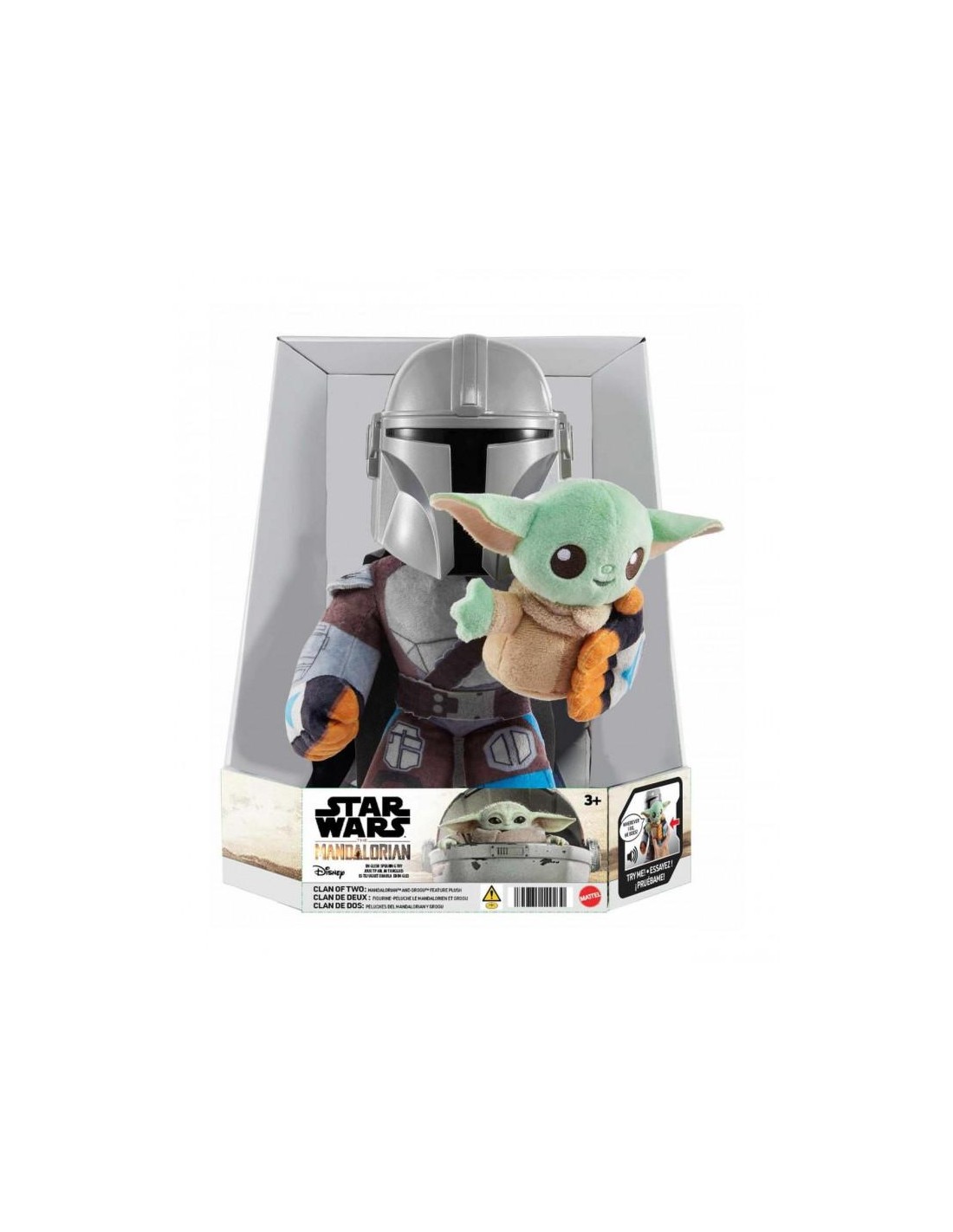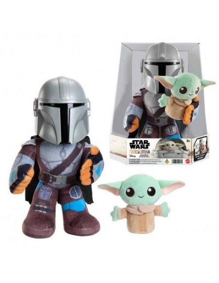 The Mandalorian, también conocido como Din Djarin. Con 28 cm de alto, el peluche de The Mandalorian tiene la cabeza esculpida y el cuerpo de peluche, mientras que el peluche de Grogu es más pequeño (unos 10 centímetros) y puedes colocarlo sobre los brazos de The Mandalorian para que lo proteja o separarlo para poder achucharlo y tener más oportunidades de juego.