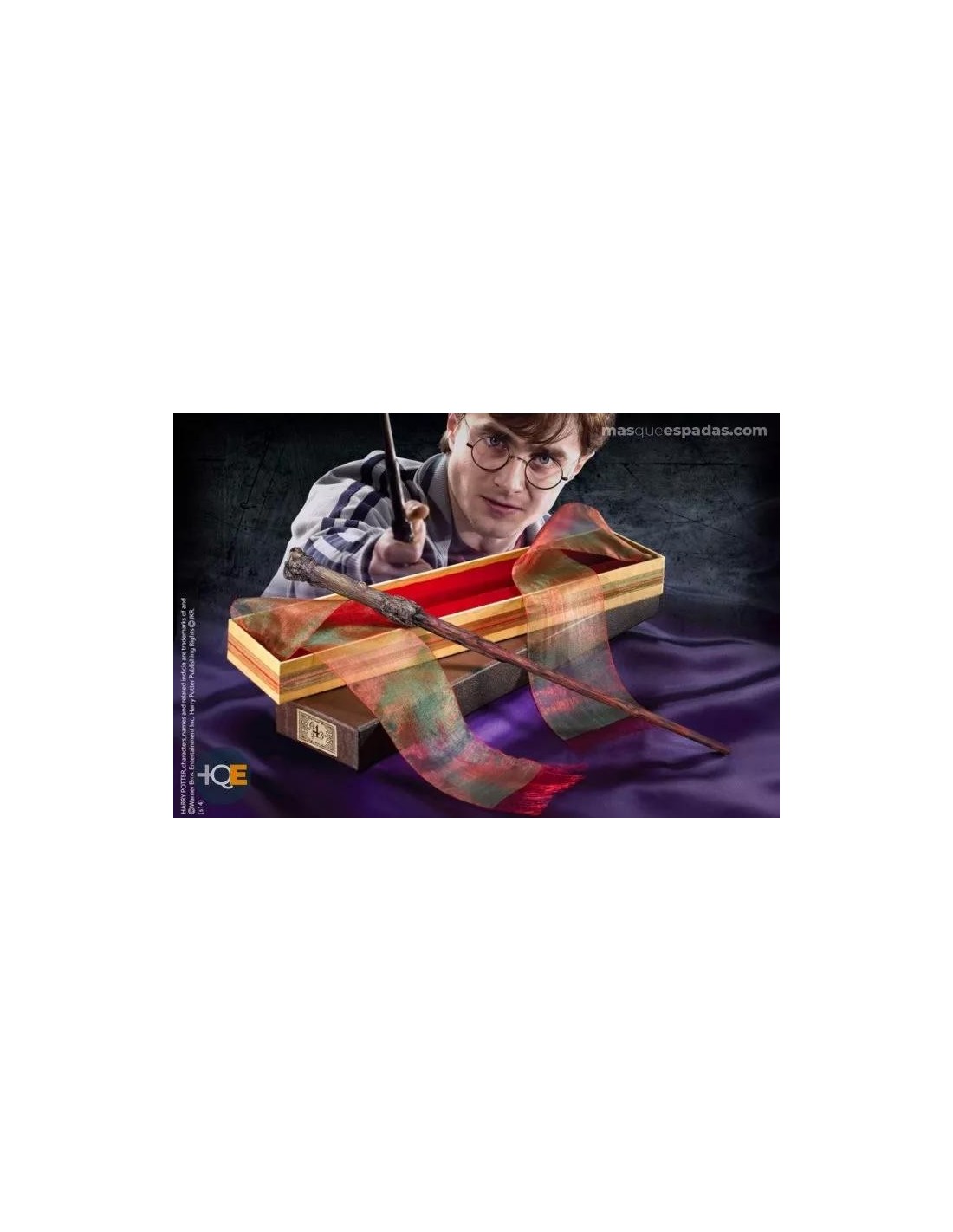 La varita que eligió Harry Potter, el niño que sobrevivió, cuando visitó la tienda de varitas de Ollivanders a los 11 años, presentada en una caja de Ollivanders.
